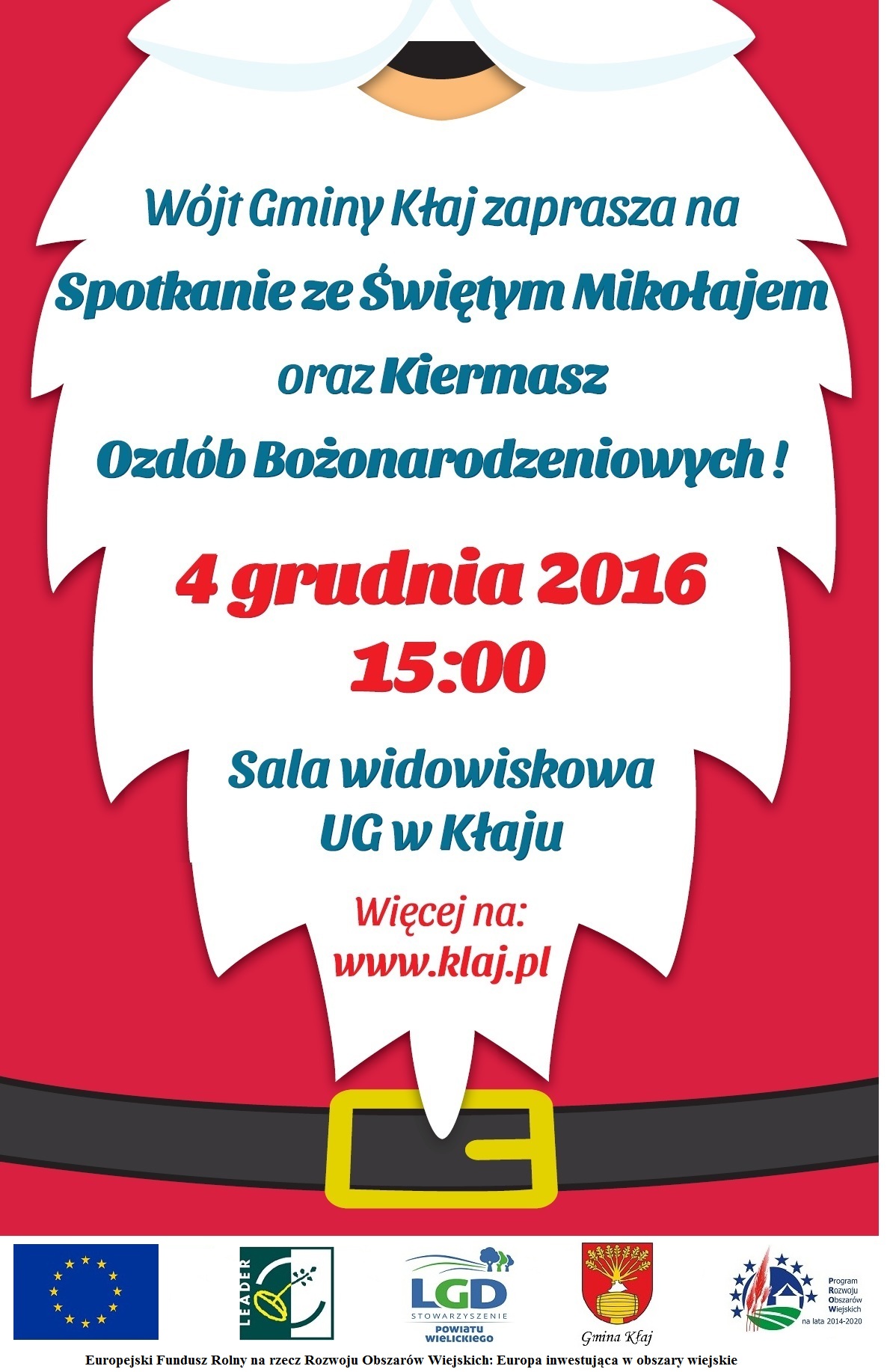Wójt Gminy Kłaj zaprasza na Spotkanie ze Świętym Mikołajem oraz Kiermasz Ozdób Bożonarodzeniowych.